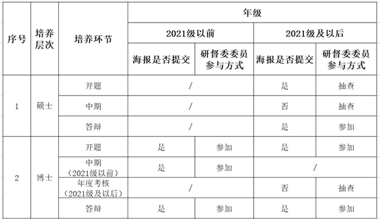 为进一步提高研究生培养质量,澳门六合彩预测 于2023年9月修订《澳门六合彩预测(中国)官方网站 研究生培养过程督导工作实施细则(试行)》(见附件1)。修订后各培养节点材料提交简表如下: