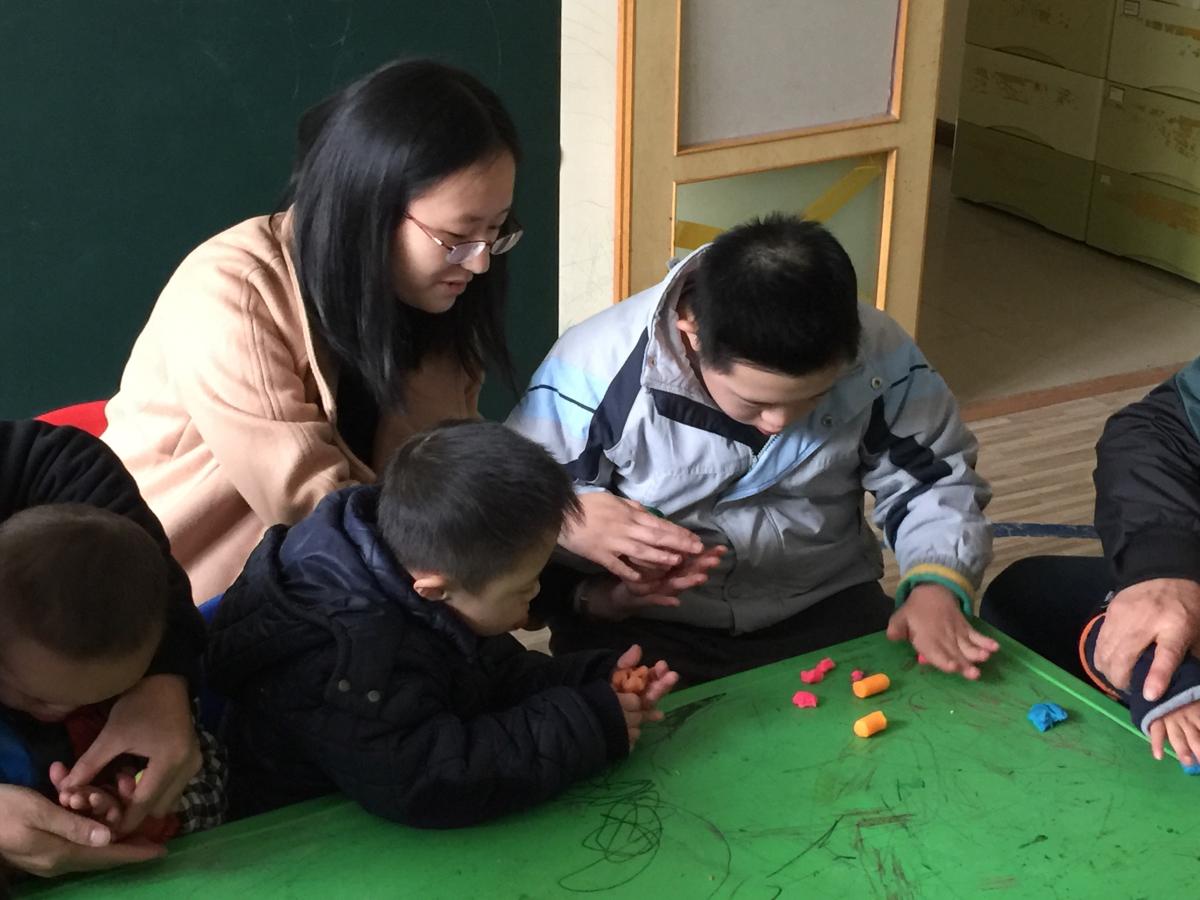 下午2时许,先锋队成员们来到成都唐氏互助协会。首先,成员们和唐宝们一一进行了简单的自我介绍,唐宝们由于刚见到陌生的人,还略感觉紧张与拘谨。接着,我们进行了第一个游戏——捏泥人,希望通过手工游戏增进和孩子们的距离,唐宝们每人会拿到一些橡皮泥,尝试捏一个小鸟的图形,对于正常年龄段的儿童来说,这应该是能很顺利的完成图形,可是对于患有唐氏综合症的儿童来说,这无疑是一个很大的挑战,但在成员们耐心地教导下和唐宝他们自己的最大努力下完成了大部分的挑战。捏泥人活动结束,唐宝们对成员们不再感到陌生,也放开了手脚不再拘束,尽情和成员们玩耍交流。