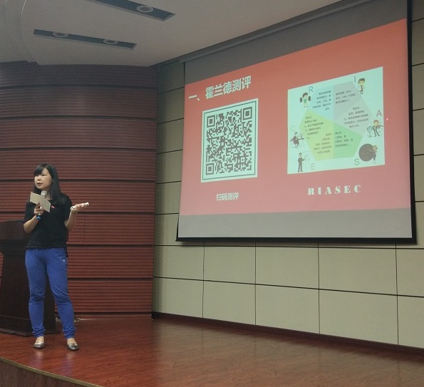 辅导员郭鑫鑫老师,主题为“迈出职业定位第一步”,参加本期课程的是2015级全体研究生。
