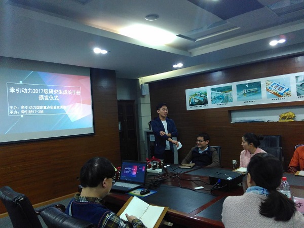 团委主办、牵引研究生17级2班承办的研究生成长手册颁发仪式在牵引红楼202室举行。学工组组长李莹老师、学工组副组长余卉老师、辅导员郭鑫鑫老师三位老师出席了仪式。活动还邀请了15级3班韩亮亮学长,合作动力人生系列讲座。仪式由17级研究生2班班长姜世霖主持。