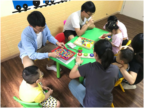 等到上课时间,三位“唐宝”也刚刚结束午休,他们精神状态都不是太好,因此首先进行的是伴随音乐的室内小跑热身运动。在志愿者的主动参与和互动下,“唐宝”们随着音乐互相追逐嬉闹,精神也饱满了起来。热身结束后就开始了第一节训练课,志愿者们首先热情地向“唐宝”们打招呼并将准备好的玩具带到他们面前,耐心地引导他们怎么把不同形状的玩具放到对应形状的孔里,在结束对“唐宝”动手能力的训练后,紧接着进行了紧张刺激的抢座位游戏,以音乐的起和止来代表开始转圈和开始抢座位,音乐的响起和结束都调动着大家的情绪。角逐出最后夺得座位的胜者后,第一节课也就到此结束了。