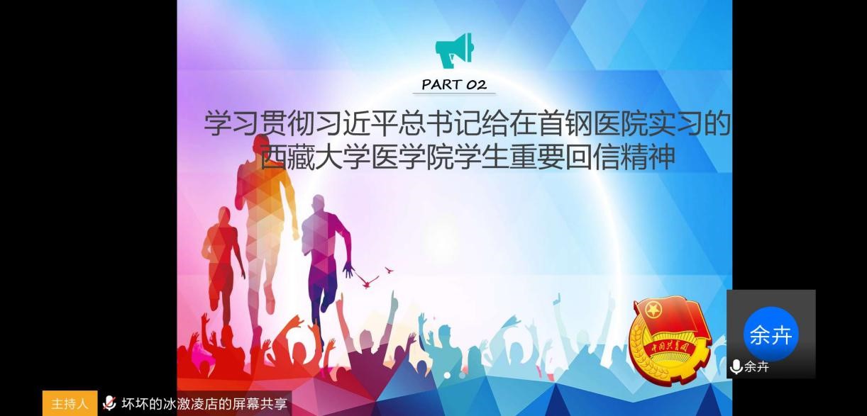研究生之窗讯(通讯员 高程程 摄影报道)为响应校团委每学期一次团课培训要求和研究生院关于认真贯彻落实《中共教育部党组关于学习贯彻习近平总书记给在首钢医院实习的西藏大学医学院学生重要回信精神的通知》工作要求,在疫情期间不放松对团干部的培养,2020年3月18日,2019-2020学年第二学期集体团课以网上团课的方式顺利开展。本次团课由团委书记余卉老师主持,主要内容是:学习贯彻习近平总书记给在首钢医院实习的西藏大学医学院学生重要回信精神,澳门六合彩预测