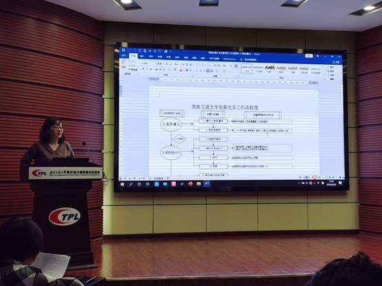 各年级党支部参加,团委书记余卉老师、党委组织员李向蔚老师讲解,新生辅导员柴一菲老师主持。本次会议共有三项内容,循序渐进向大家介绍《党支部工作记录表》撰写内容及规范要求,党员发展流程及中共西南交通大学委员会发展党员工作相关材料撰写指南以及新生党员档案核查事宜。