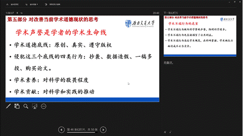 另外,宋老师还列举了学术不端的三种主要行为:捏造数据、篡改数据和剽窃。需要注意的是,一稿多投、侵占学术成果、伪造学术履历等行为同样会被认为是学术不端行为。