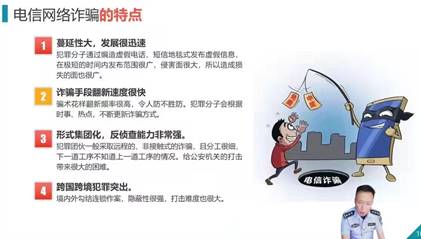 讲座伊始,赵警官向大家抛出问题:同学们生活中有遇到过电信诈骗吗?你所了解的电信诈骗有哪些形式呢?同学们据此热烈讨论。赵警官指出,电信网络诈骗是近些年来诈骗犯罪的主要形式之一,其内容层出不穷,形势发展较为严峻,需要大家拭目警惕,多学、多看、多问,防微杜渐,保护好自己的财产以免造成严重损失。