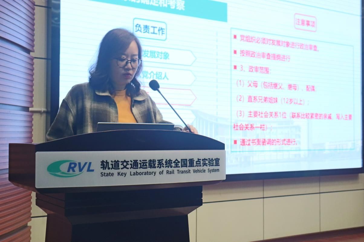 首先,李向蔚主要针对党员发展流程及注意事项进行分享。李向蔚系统介绍了党员发展总则,并详细说明从入党申请、入党积极分子的确定和培养教育、发展对象的确定和考察、预备党员的接收及预备党员的教育、考察和转正等党员发展的五个阶段及注意事项。她还就党支部书记、组织委员、宣传委员及团支书的职责和分工做了详细的说明,进一步加强了支部的规范化建设。