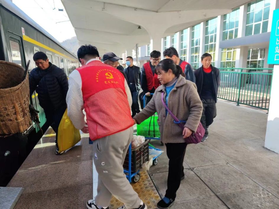 队员在实践中发现,6063次“公益性秦岭小慢车”贴心地设置了“惠学车厢”,这不仅为山区孩子求学路提供了安全保障,也给他们提供了良好的学习环境。同时车上还有“惠农车厢”,车厢设置了货架来放置老乡们的农产品,也给老乡们提供了现场交易的场所。实践队员还分别对通勤工人、往返学生以及普通居民进行了调研并提供志愿服务,从而切身感受到该趟列车为秦岭山区的老百姓往返于大山与城镇之间提供的便利。