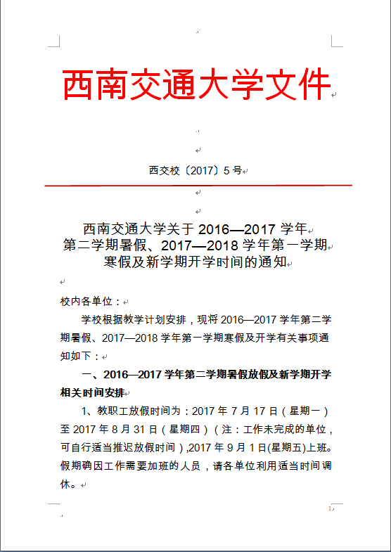 【转发校办】西南交通大学关于2016-2017学年第二学期暑假、2017-2018学年第一学期寒假及新学期开学时间的通知