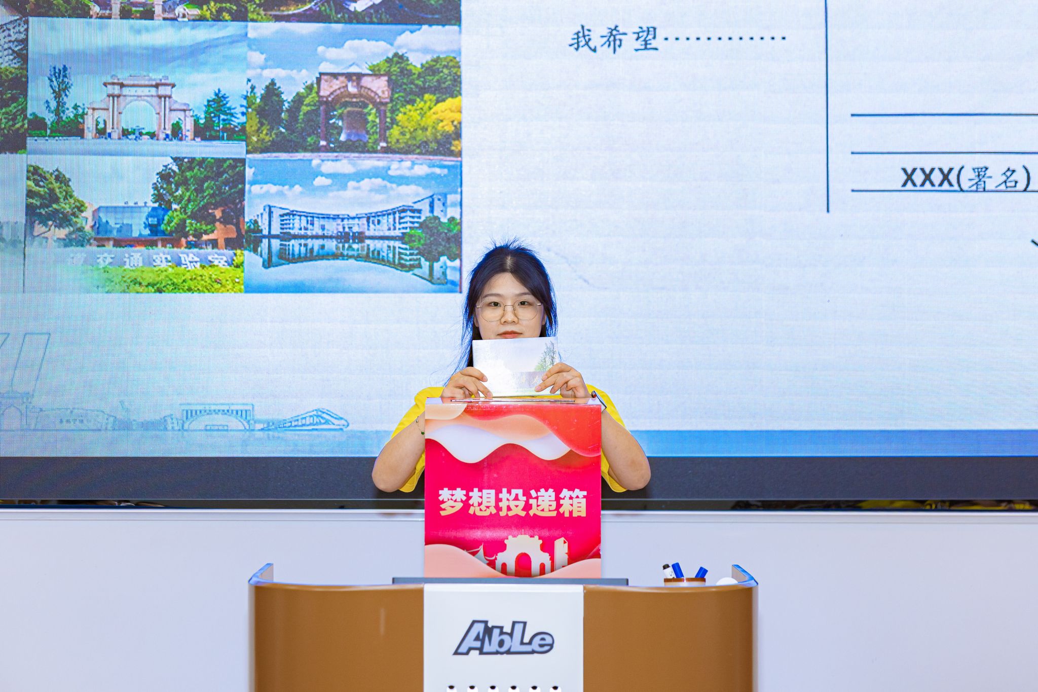 精心挑选的明信片上,写下自己三年后最希望实现的目标并郑重地签下自己的名字,教师们也纷纷写下对新生的期望与祝福。最后教师代表陈是扦和各班代表收集师生手写期望的明信片,并现场进行投递仪式。