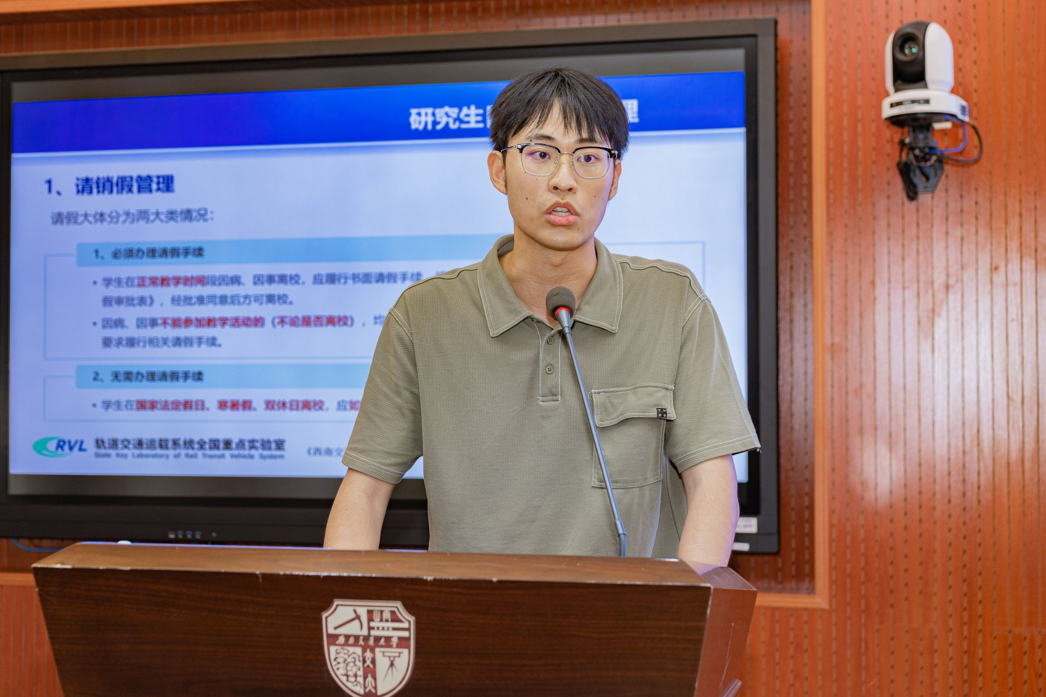 接着,2025级辅导员陈宇豪向同学们讲解研究生日常管理及奖勤助贷相关内容。他主要从请销假制度、宿舍管理、奖助学金、申请入党等几个方面进行了介绍,叮嘱同学们要严格遵守学校的规章制度。
