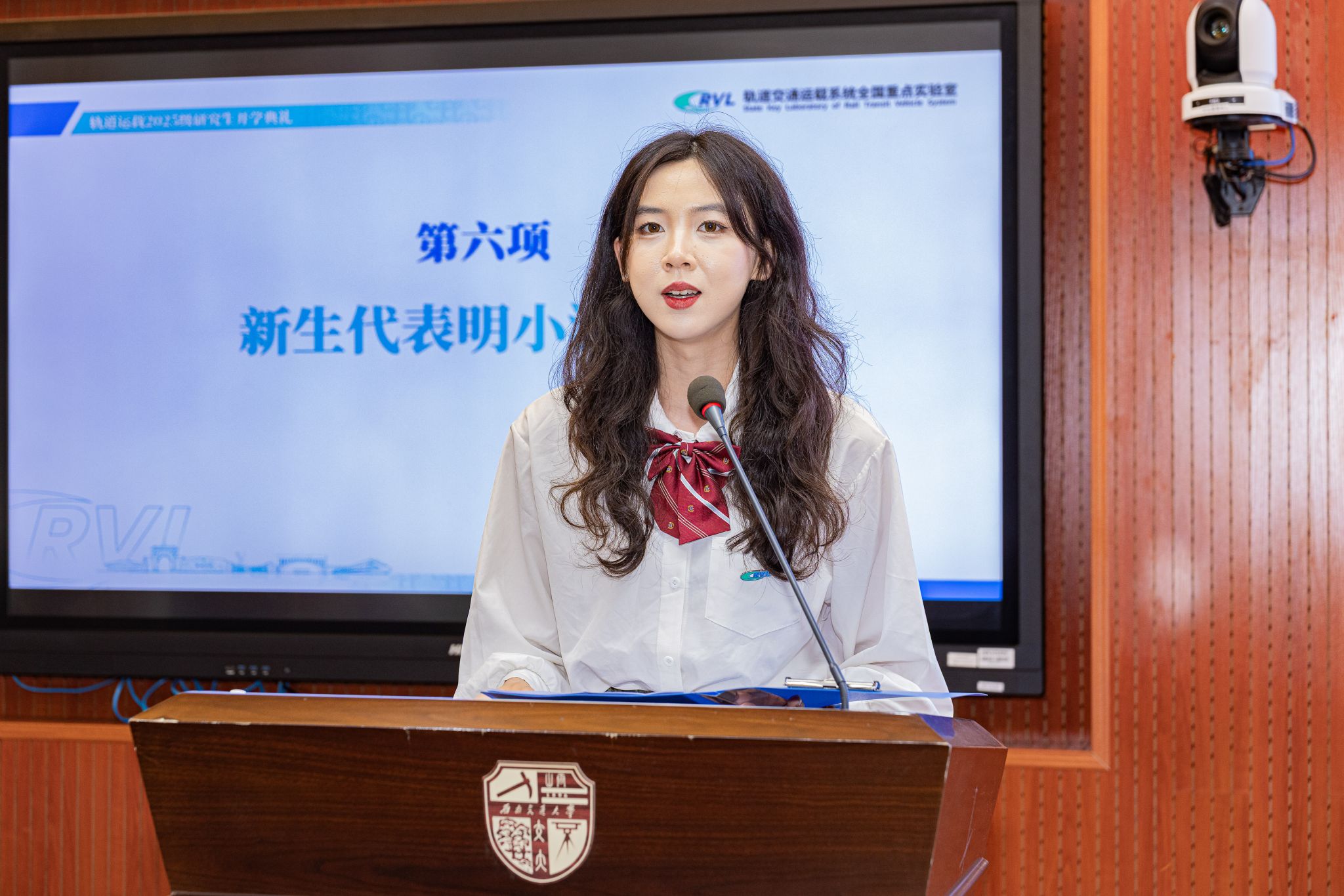 2025级新生代表明小涵同学发言。明同学倡导同学们时刻谨记交大校训,将个人理想融入民族复兴伟业,在强国建设中实现人生价值,在担当奉献中彰显青春力量。