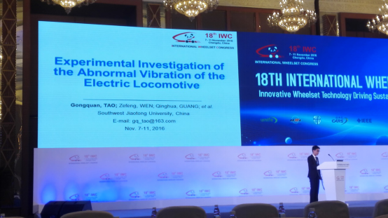 大会中,翟婉明院士做了题为“Wheel-rail dynamic interaction caused by change of wheel and rail profiles”的特邀报告,向全世界同行生动展示了中国在铁路大发展时期的重要研究进展,并主持了主题为“New technology of non-destructive testing for wheelset” 的分会报告及讨论。张卫华教授主持了主题为“Interaction between wheel and rail, innovations in high speed technology” 的分会报告及讨论。赵鑫副研究员做了题为“Observations and monitoring of the rolling contact fatigue of Chinese high speed wheels”的口头报告,详细地为与会者介绍了中国高速铁路轮轨滚动接触疲劳的现状与解决措施,得到与会者的一致好评。博士生陶功权同学做了题为“Experimental investigation of the abnormal vibration of the electric locomotive”的口头报告,报告介绍了现场调研和数值仿真的相关结果,确定了电力机车异常振动来自车轮多边形磨耗的原因及缓解措施,得到了听众的认可。澳门六合彩预测