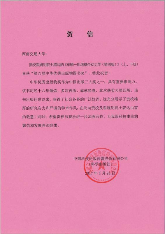 近日,科学出版社发来贺信,就西南交通大学首席教授翟婉明院士的专著《车辆-轨道耦合动力学》(第四版)荣获“第六届中华优秀出版物图书奖”一事表示祝贺。 中华优秀出版物奖作为中国出版三大奖之一,具有重要影响力。