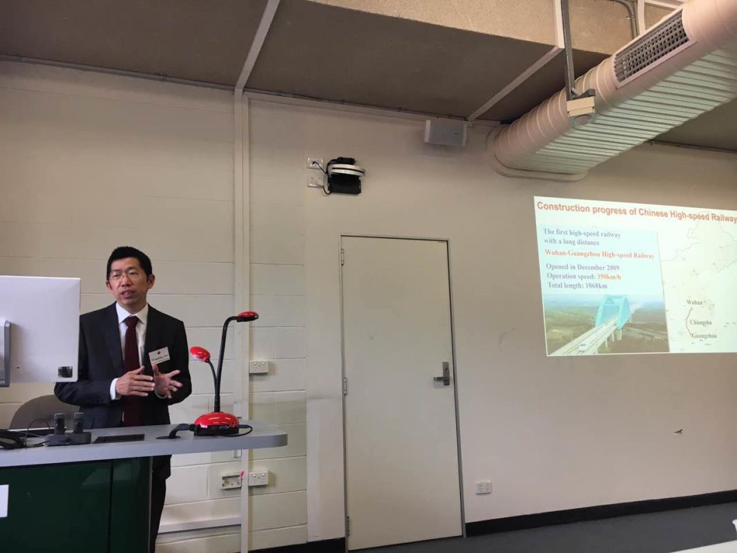Australia & China)”双边研讨会,对近年来双方开展的科研活动和成果以及今后的研究重点进行了广泛和深入交流。该校土木工程与建筑环境学院院长Stephen Kajewski教授首先对此次双边研讨会致欢迎词,随后进行了7个学术报告,我校代表团做了3个专题报告,分别为:翟婉明院士题为“Technological