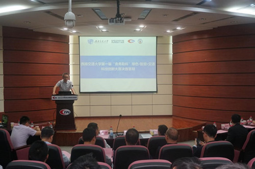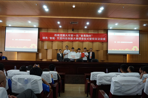 2019年5月18日下午两点,西南交通大学第一届"舍弗勒杯"绿色·智能·交通科技创新大赛颁奖仪式在犀浦校区二号报告厅举行。舍弗勒大中华区首席技术官刘泳,西南交通大学副校长朱健梅,以及学校老师和舍弗勒的诸多领导参加了此次会议。朱健梅副校长,做了开幕致辞。朱副校长感谢了舍弗勒公司对学校学生创新的大力支持,举办的第一届"舍弗勒杯"创新大赛也引起了学生们的高度关注和积极参与。同时,朱副校长也向同学们简单介绍了舍弗勒公司基本概况。随后舍弗勒大中华区首席技术官刘泳发表致辞,赞赏了同学们的科技创新精神。也表示舍弗勒公司需要同学们的科技创新创新,"舍弗勒杯"科创比赛也会接着办下去。