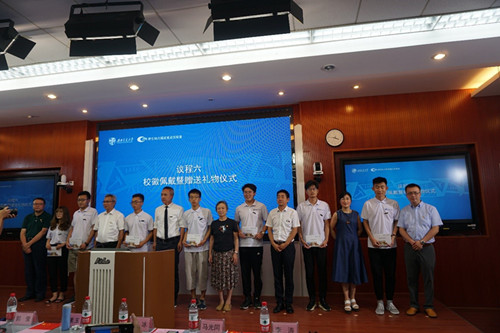 图7 教师代表为新生代表佩戴校徽并赠送礼物