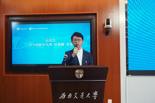 接下来,2019级新生代表,载运三班的姚春醒同学代表全体新生发言。他号召全体新生要有锲而不舍的耐心、自强不息的信心和承担责任的决心,在奋力实现祖国更加繁荣的历史进程中,在为世界创造价值的理想追求中,倾注我们的每一份智慧,贡献我们的每一份力量!