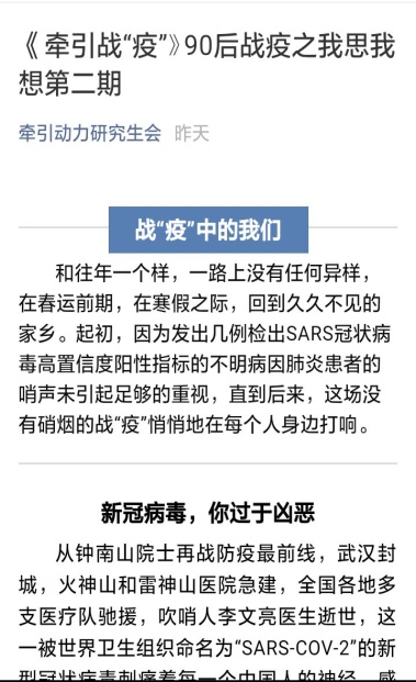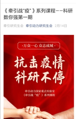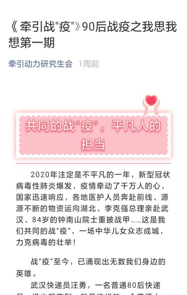 师生中涌现出“爱心捐赠 支援武汉”和“志愿服务 共克时艰”等动人事迹,体现了课程思政的独有魅力。为展现90后研究生在疫情之下对家国和自我、对历史和现实、对人生和理想的思考和感人事迹,在线课程新增“90后战‘疫’之青春担当”和“90后战‘疫’之我思我想”两个专题。进而构建2大系列共6个专题的《牵引战“疫”》线上思政课程,筑牢青年学子成长成才的思想根基。自2月10日至今,已推送14期,深受老师和同学们的喜爱。