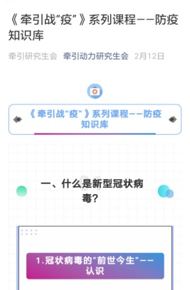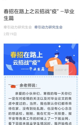 党委、学生工作组指导研究生会精心策划《牵引战“疫”》系列网络思政在线课。牵引研究生会在网络调研获得一手资料后,结合同学们的实际需求,确定了以“防疫知识库”、“科研数你强”、“资源在线淘”、“春招在路上”等四大专题为支撑的课程框架,通过分类整理有效信息、邀请老师录制学术科研分享视频、搜索丰富学习资源、指导毕业生就业等方式,为研究生居家科学防疫、提升科研能力、掌握实用技能、克服就业困难等提供在线指导,解决学生的实际问题与困难。战“疫”在线课利用网络思政资源,借助微信公众号平台,将辅导员和导师拉入虚拟网络,即使与学生相隔千里也能就同一主题互动谈心、悉心指导,提升了网络思政教育的针对性和亲和力。网络思政在线课的部分做法获得兄弟院系的认可,在其公众号转发和推送,资源也得到更大范围的推广和共享,收到较好实效。