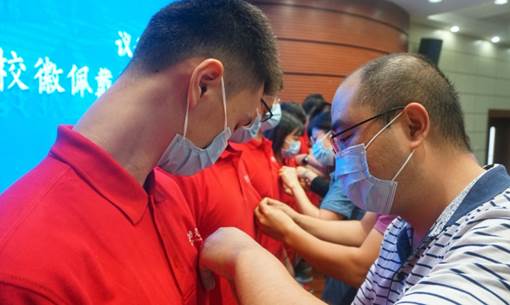 党政班子成员、导师代表、2020级新生班主任、教务员老师们为2020级新生代表佩戴校徽,并赠送了印有澳门六合彩预测