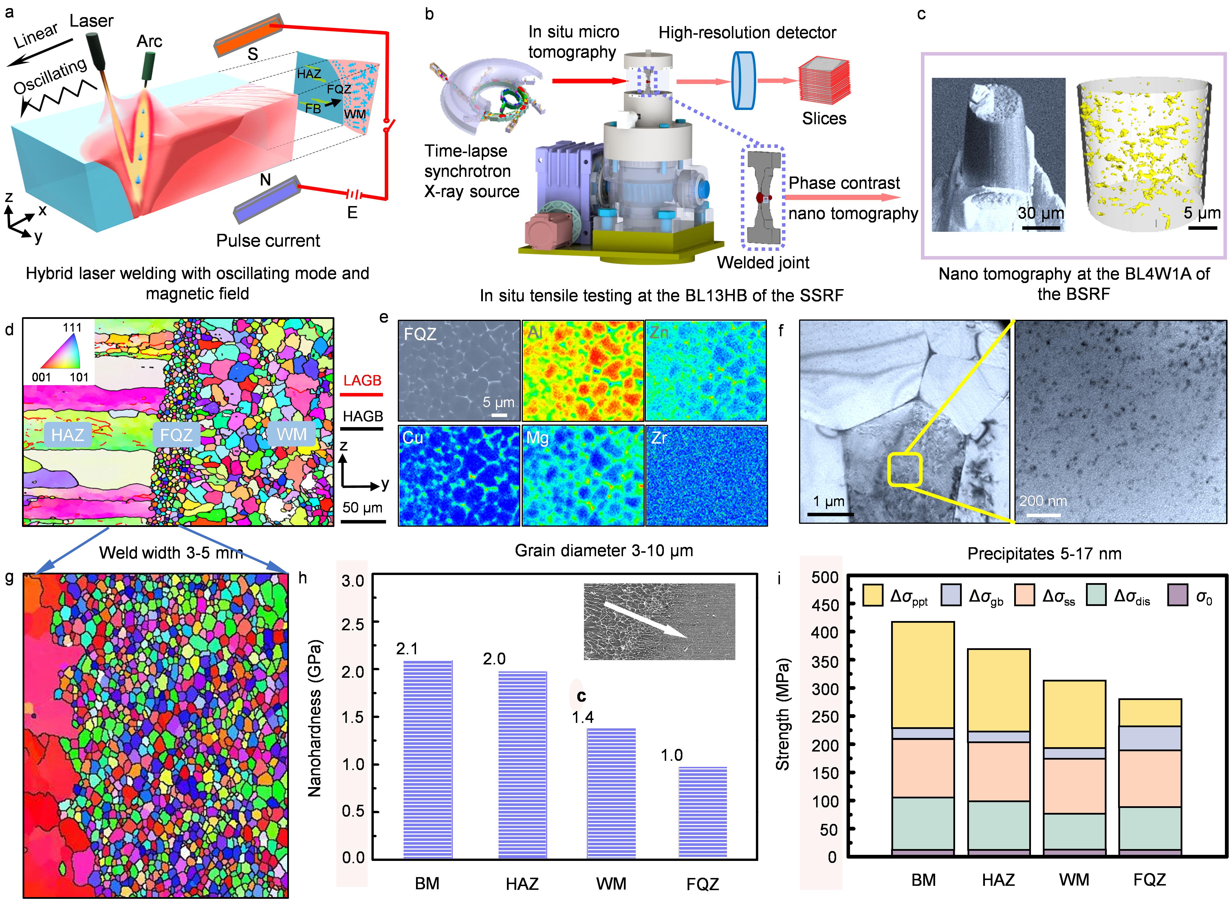 深入研究发现,细晶带内部的细小等轴非枝晶是以母材中高温稳定相经异质形核而成,适宜的温度梯度和熔池扰动共同决定了细晶带形成于HAZ区域。调节工艺参数能够改变细晶带的宽度,但无法完全消除细晶带。基于高分辨X射线原位多尺度关联成像技术,发现影响7050铝合金接头性能劣化的本质因素,探明了细晶带软化及沿晶失效机制,进而提出了一种全新的“激光扰动+磁场脉冲”联合制造策略,通过调控细晶带的区间分布,大幅提升了激光熔焊接头的强韧性,高于搅拌摩擦焊。相关成果以题为“Inhibiting weld cracking in high-strength aluminium alloys”发表在Nature Communications上,第一作者为西南交大牵引动力国家重点澳门六合彩预测