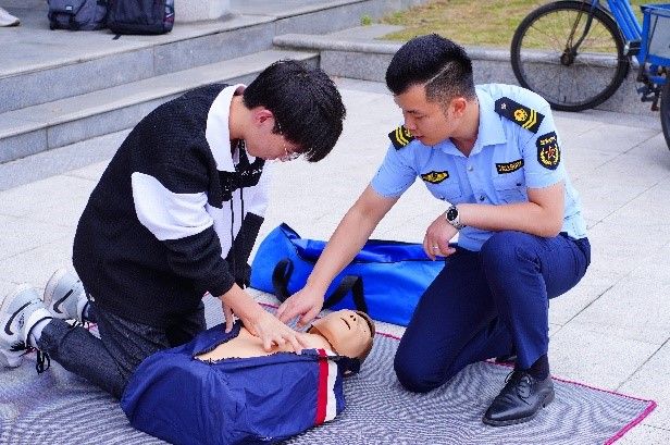 培训中李金权教官邀请学生展示消防器材的用法,邀请学生讲解灭火器用法,表示灭火器正确使用方法“提、拔、握、压”。他指出消防安全的三道防线为预警、灭火、逃生,火灾不可控时,应及时佩戴防毒面罩走消防通道逃离火灾现场。家里应常备消防设备有烟感器、灭火器、灭火毯及防毒面具。随后所有参会人员前往新大厅进行消防演练,李金权展示了灭火器的正确使用步骤、方法和灭火姿势,然后所有参会人员有序使用灭火器进行实操灭火。然后李金权指导各个参会人员进行心肺复苏实操。