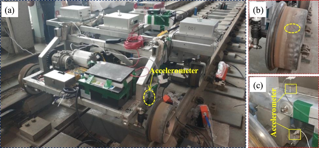 Fig. 12. Vibration measurement of a track inspection vehicle with a wheel defect. (a) The vehicle. (b) Wheel defect. (c) Measurement position.