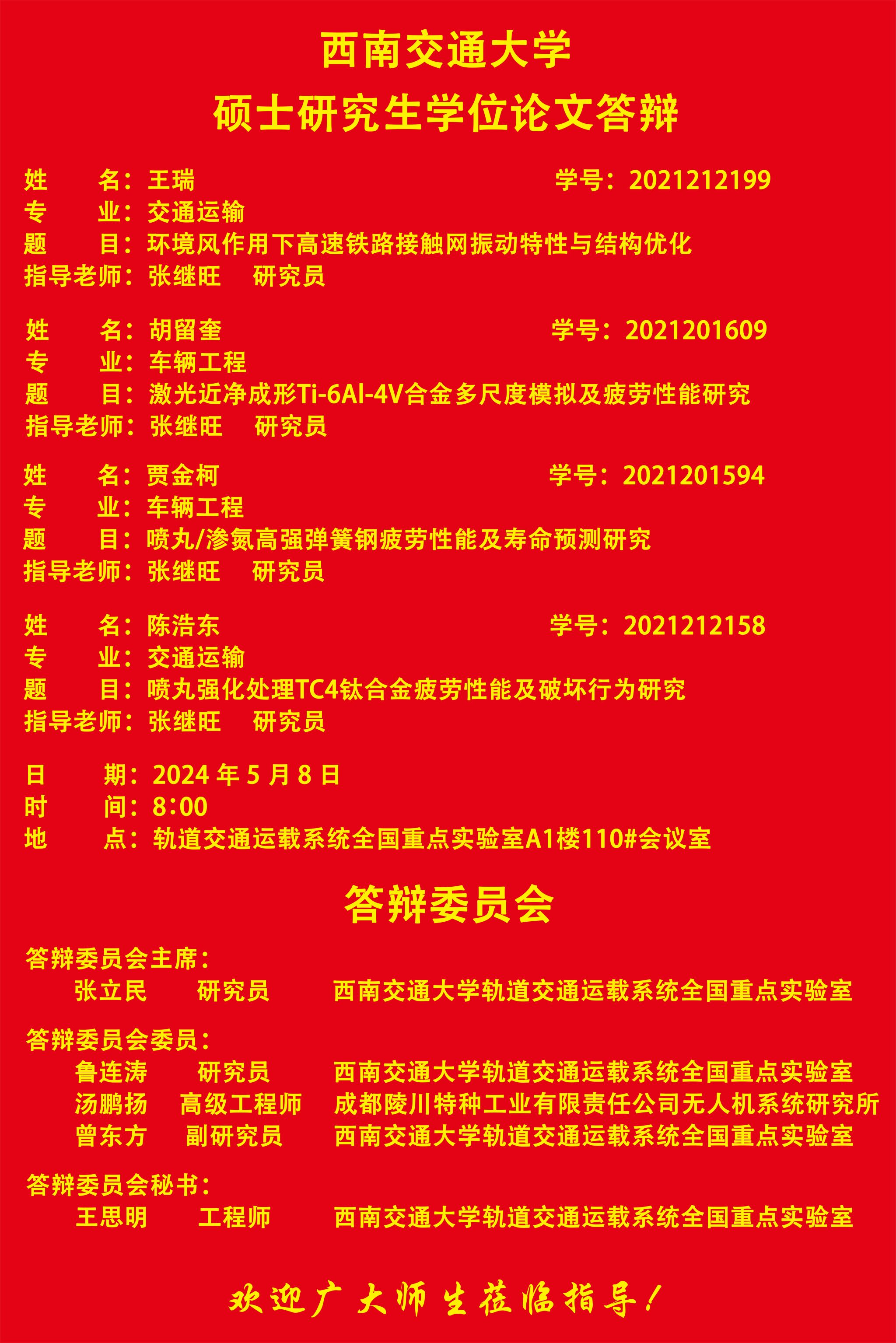 西南交通大学王瑞、胡留奎、贾金柯、陈浩东硕士学位论文答辩
