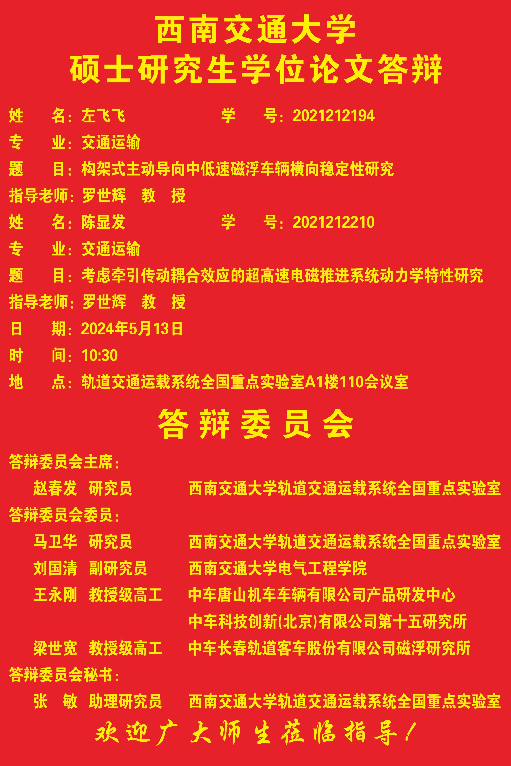 西南交通大学左飞飞、陈显发硕士学位论文答辩