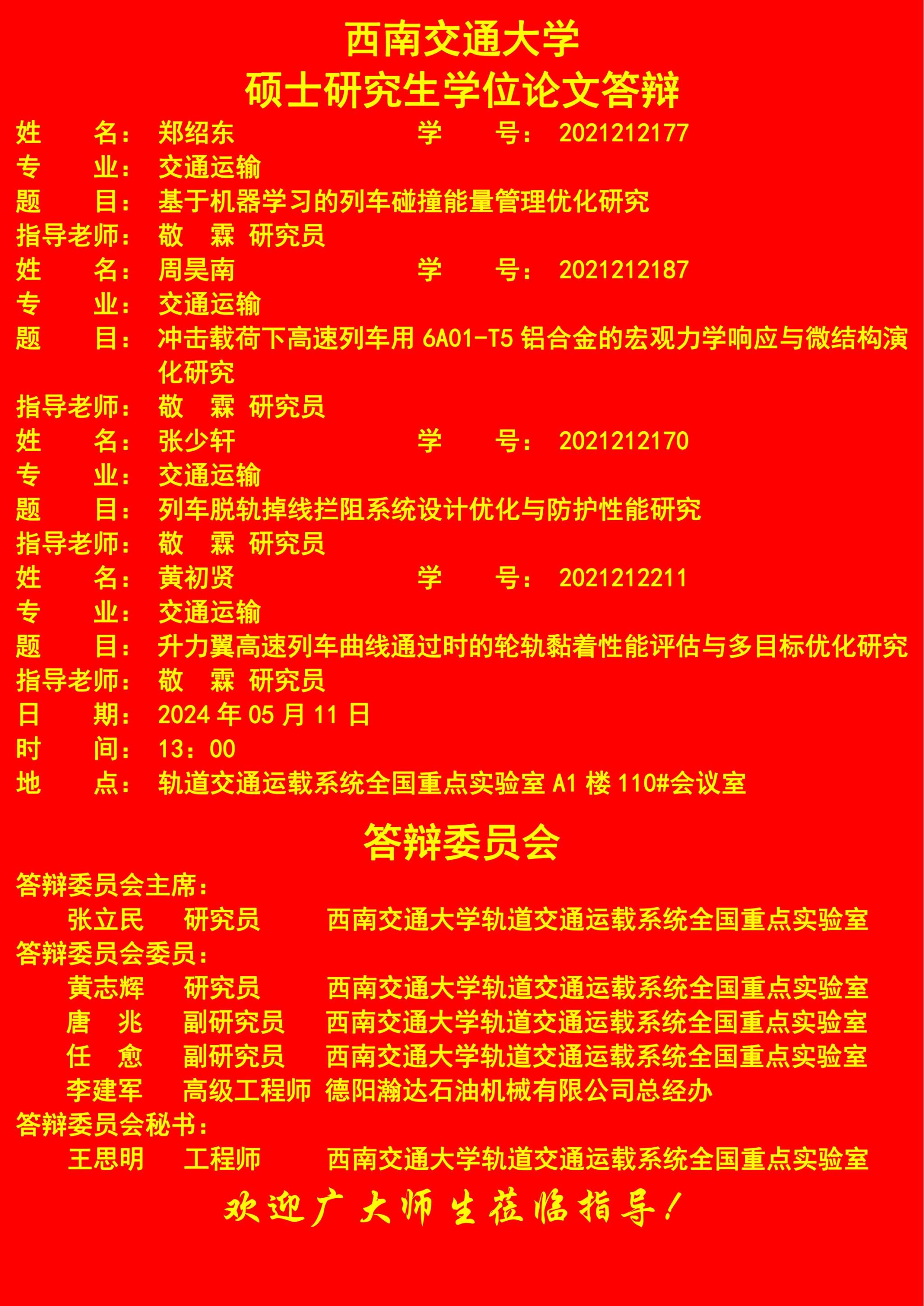西南交通大学郑绍东 周昊南、 张少轩、 黄初贤硕士学位论文答辩