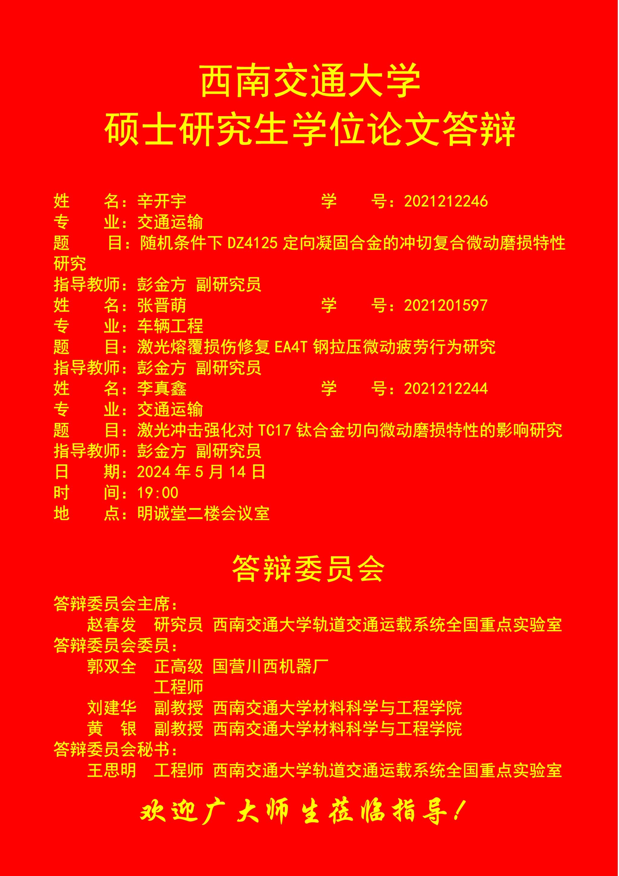 西南交通大学张晋萌、辛开宇、李真鑫硕士学位论文答辩