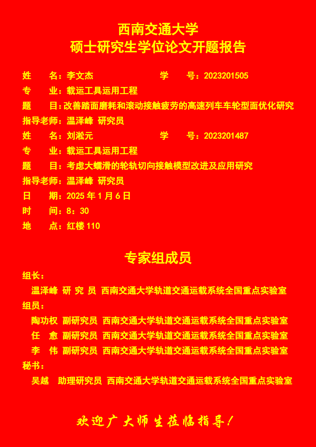 西南交通大学李文杰、刘淞元硕士研究生开题报告