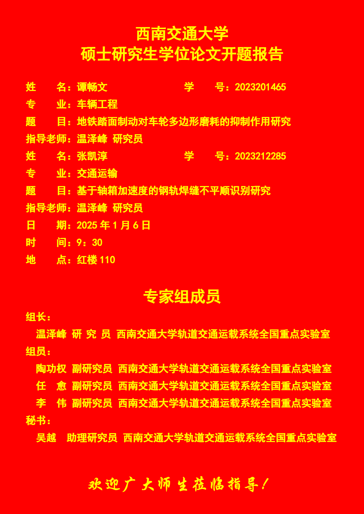 西南交通大学谭畅文、张凯淳硕士研究生开题报告