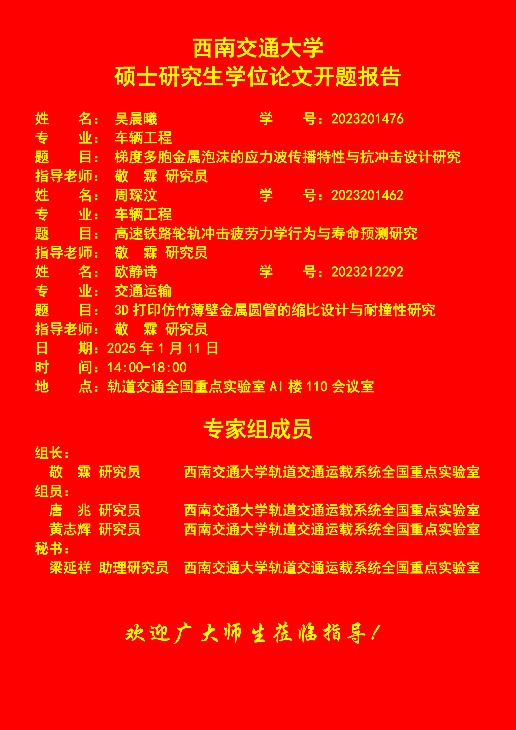 西南交通大学吴晨曦、周琛玟、欧静诗硕士研究生开题报告