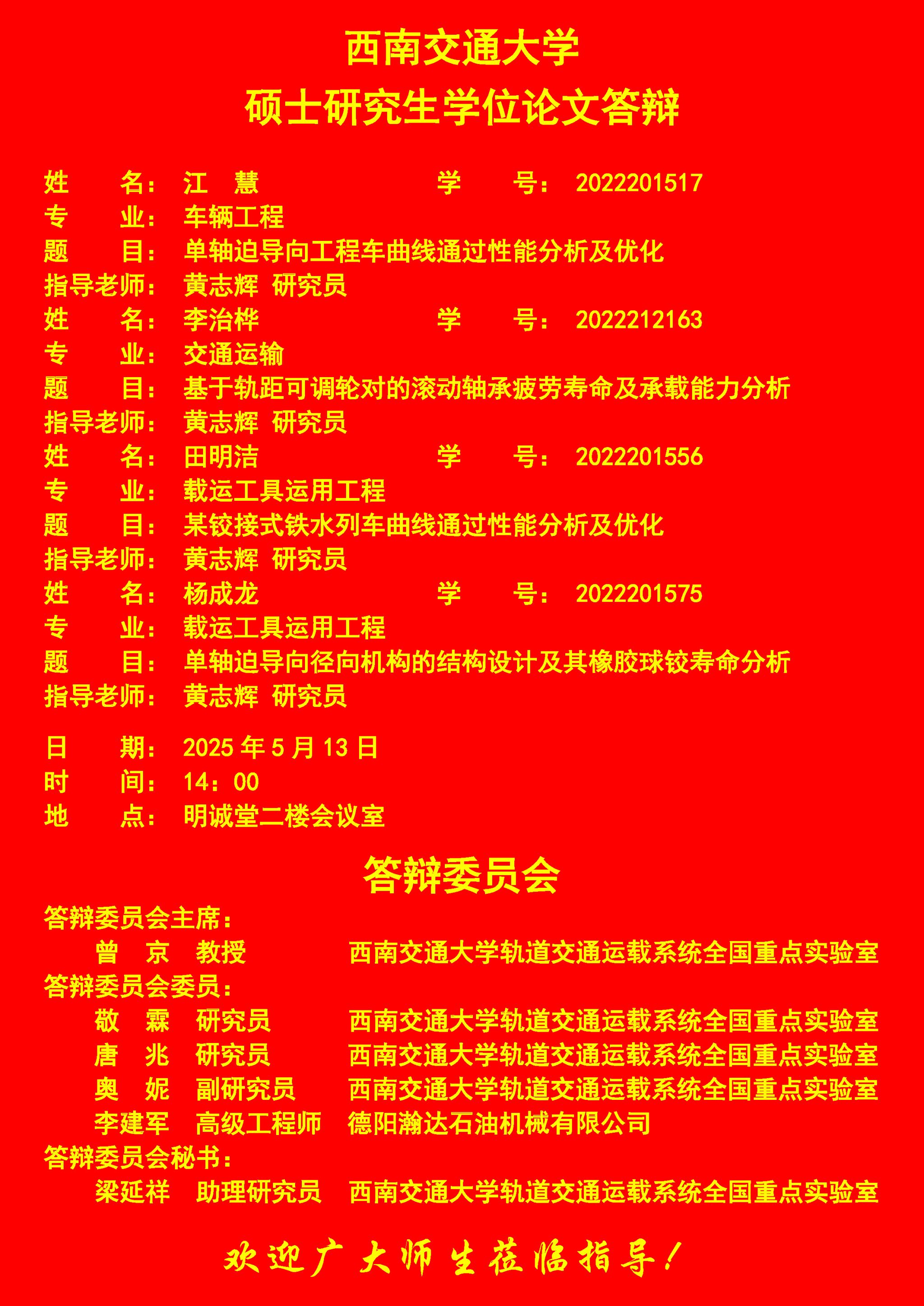 西南交通大学 江慧、李治桦、田明洁、杨成龙硕士论文答辩