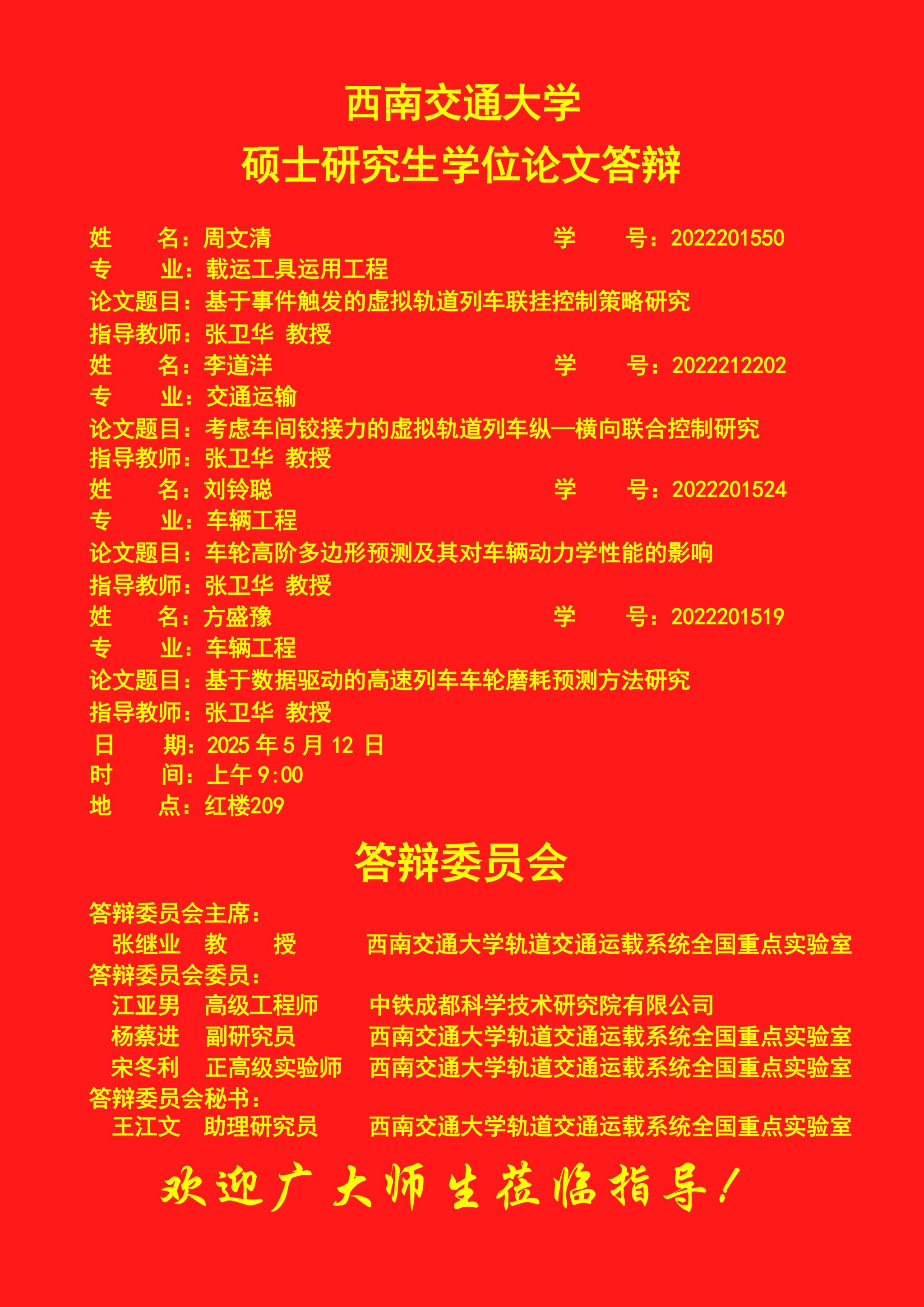西南交通大学方盛豫、周文清、李道洋、刘铃聪硕士学位论文答辩