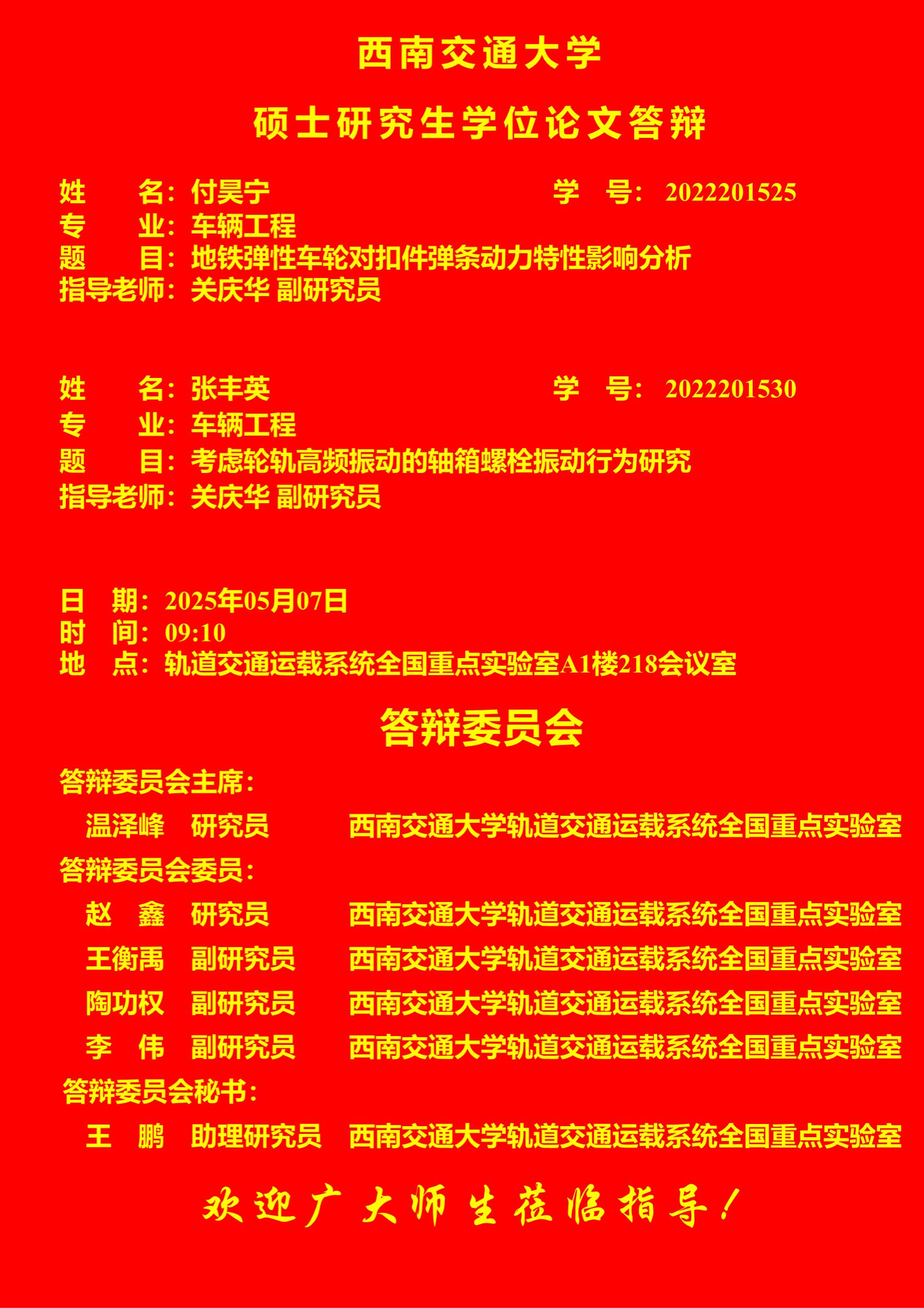 西南交通大学付昊宁、张丰英硕士研究生学位论文答辩