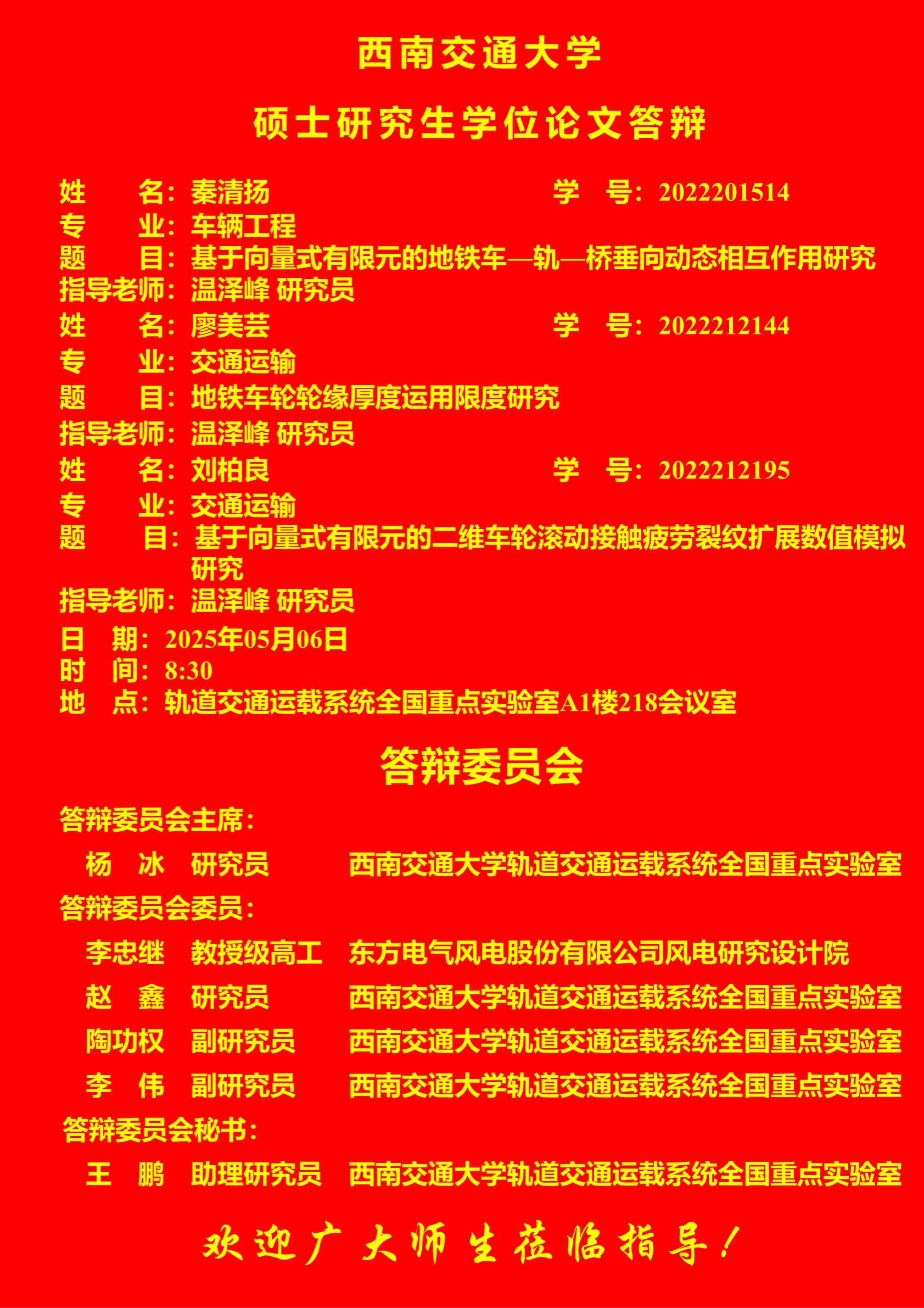 西南交通大学秦清扬、廖美芸、刘柏良硕士研究生学位论文答辩