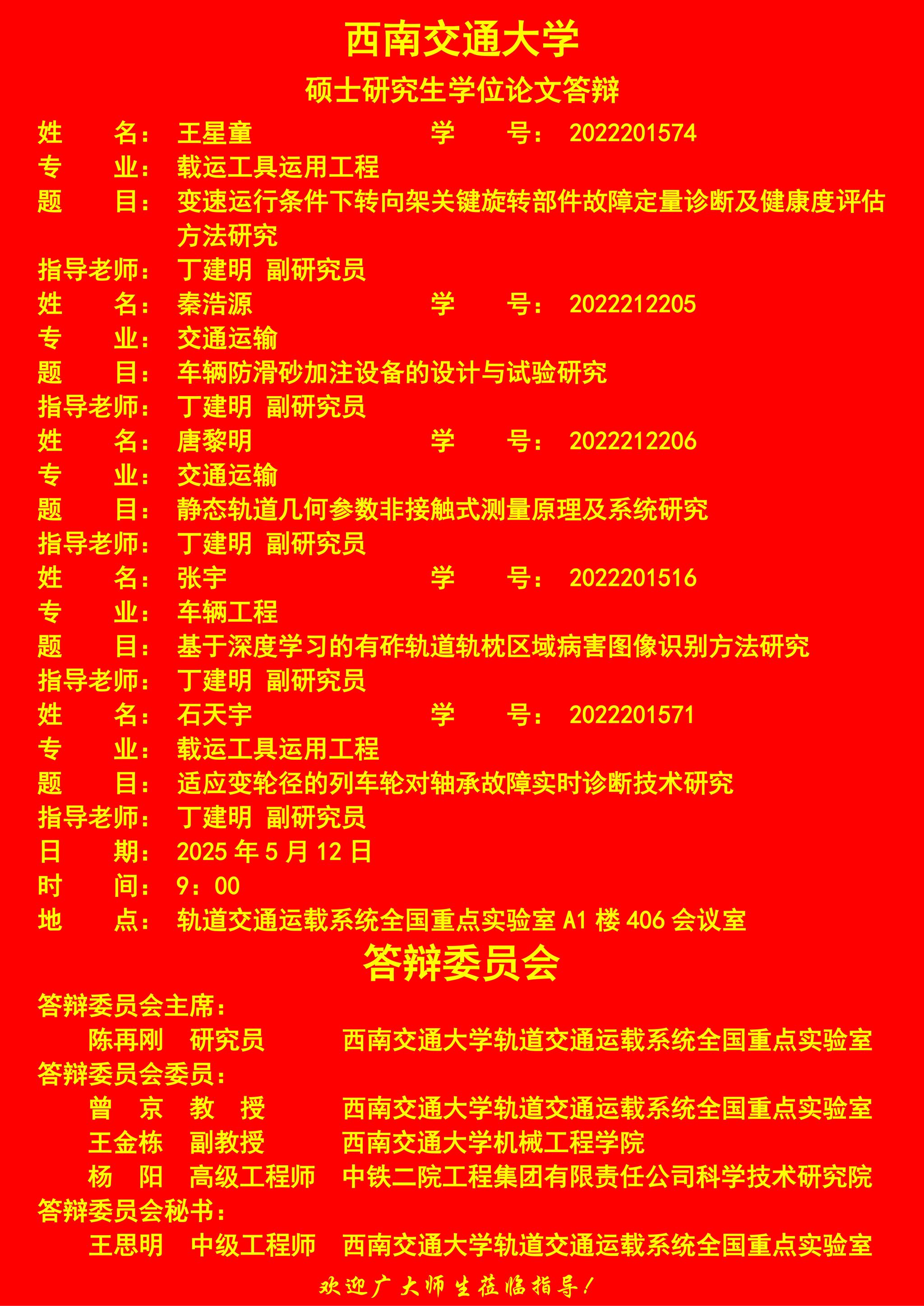 西南交通大学王星童、秦浩源、唐黎明、张宇、石天宇硕士研究生学位论文答辩