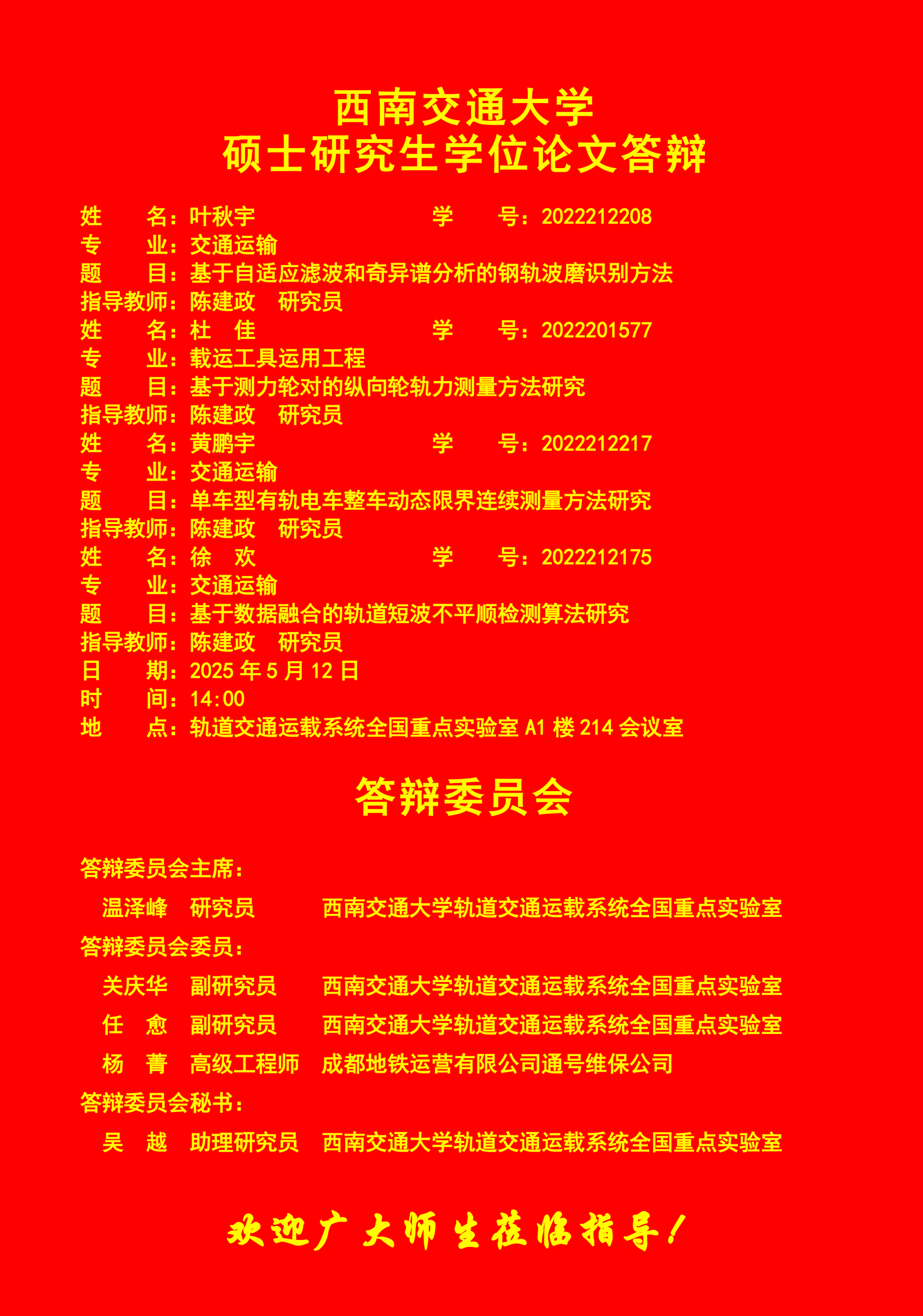 西南交通大学叶秋宇、杜佳、黄鹏宇、徐欢硕士学位论文答辩