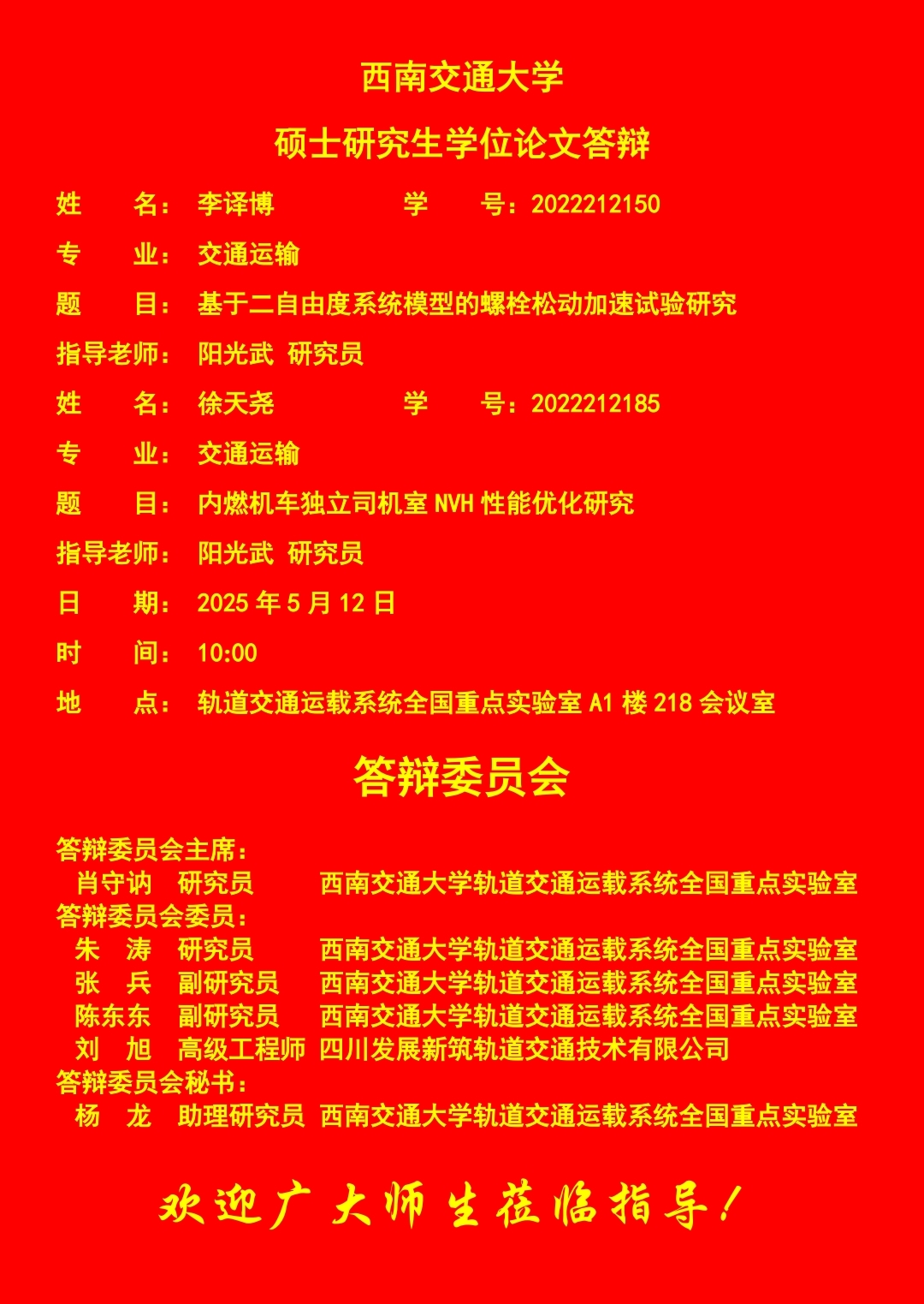 西南交通大学李译博、徐天尧硕士学位论文答辩