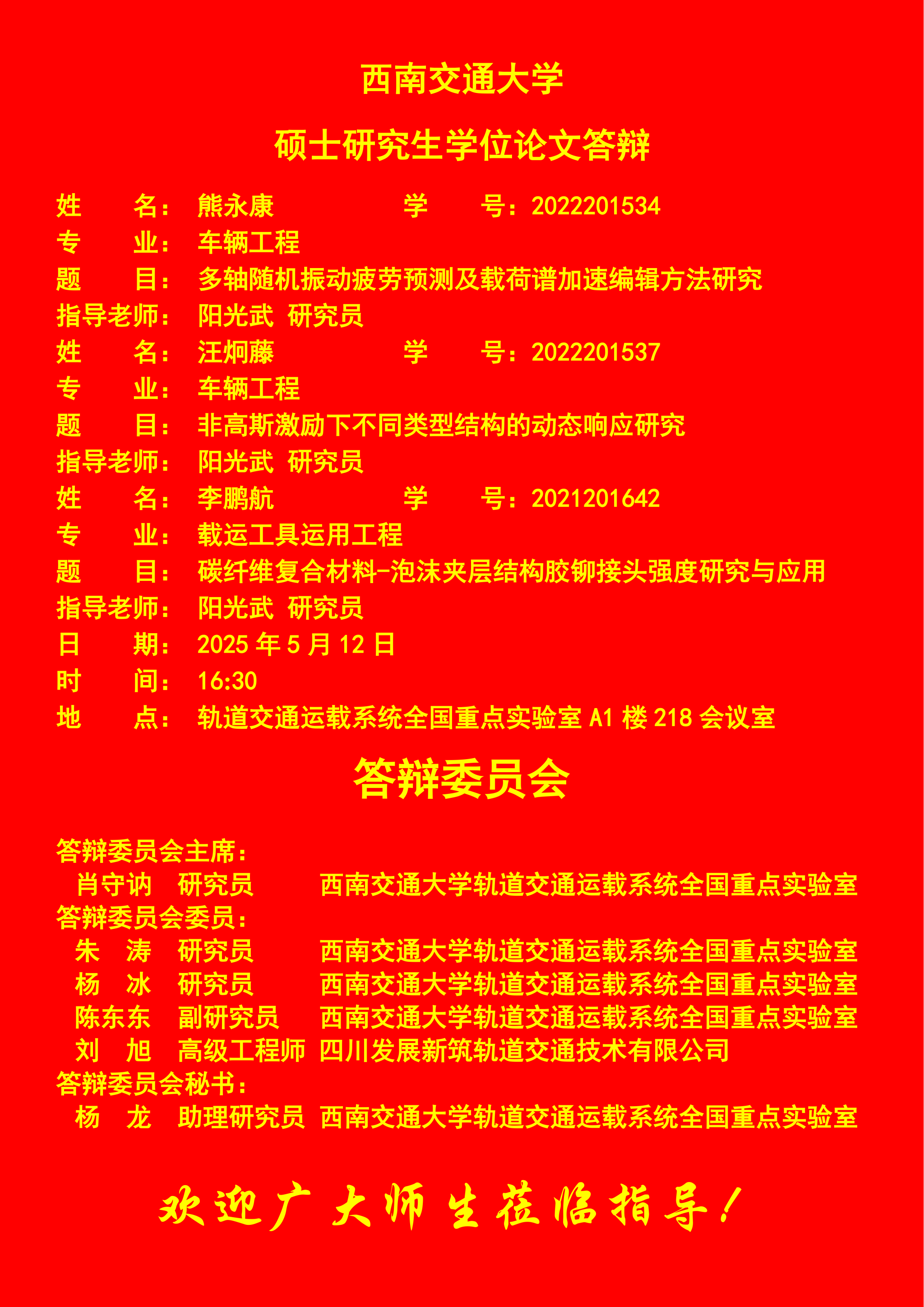 西南交通大学熊永康、汪炯藤、李鹏航硕士学位论文答辩