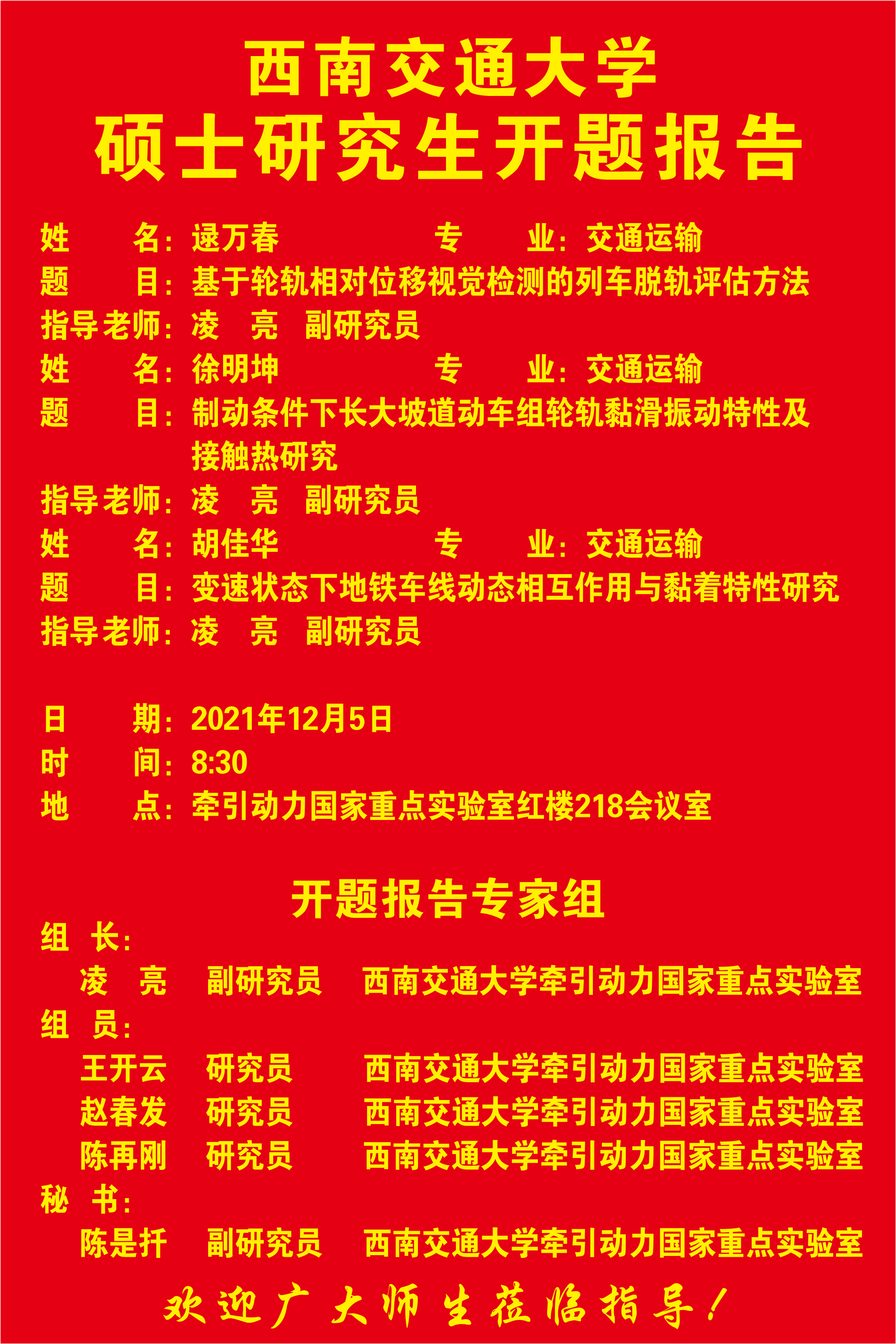 西南交通大学逯万春、徐明坤、胡佳华硕士研究生开题报告
