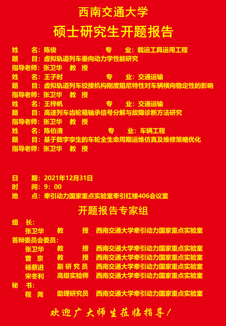 西南交通大学陈俊、王子时、王梓帆、陈伯清硕士研究生开题报告