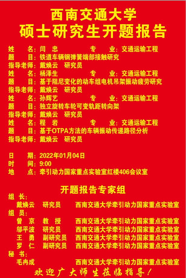 西南交通大学闫忠、杨泽生、孙辉艺、程岩硕士研究生开题报告