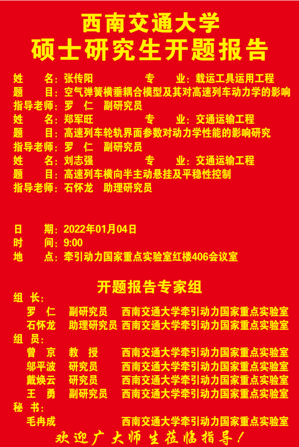 西南交通大学张传阳、郑军旺、刘志强硕士研究生开题报告