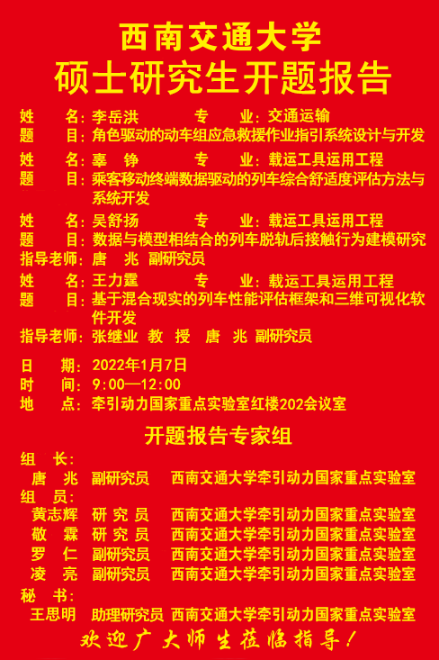 西南交通大学李岳洪、辜铮、吴舒扬、王力霆硕士研究生开题报告