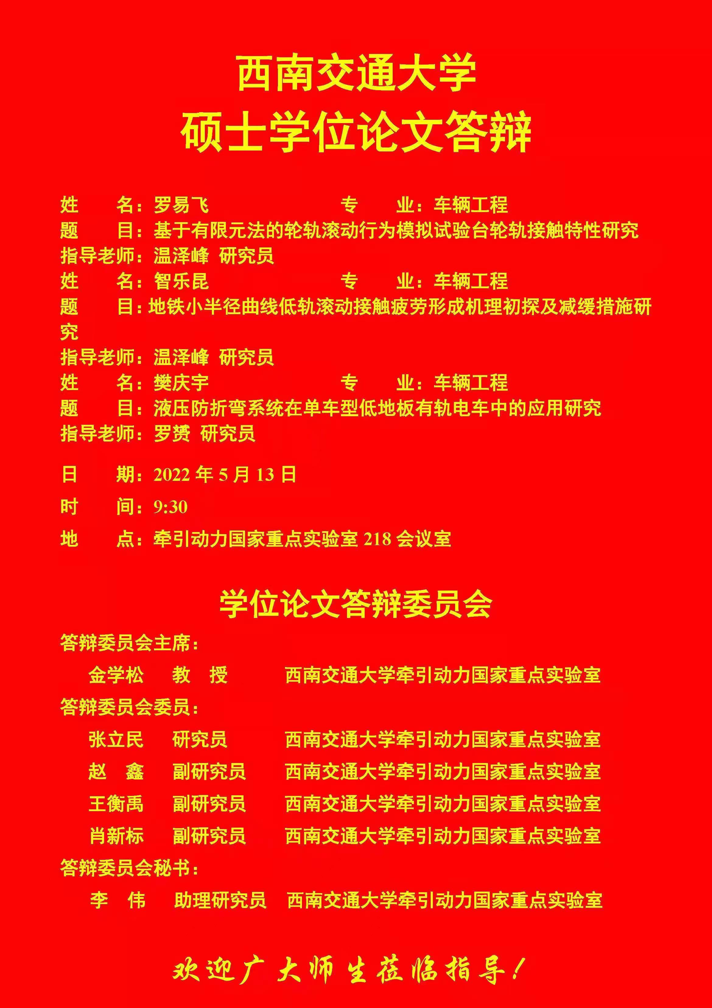 西南交通大学罗易飞、智乐昆、樊庆宇硕士学位论文答辩
