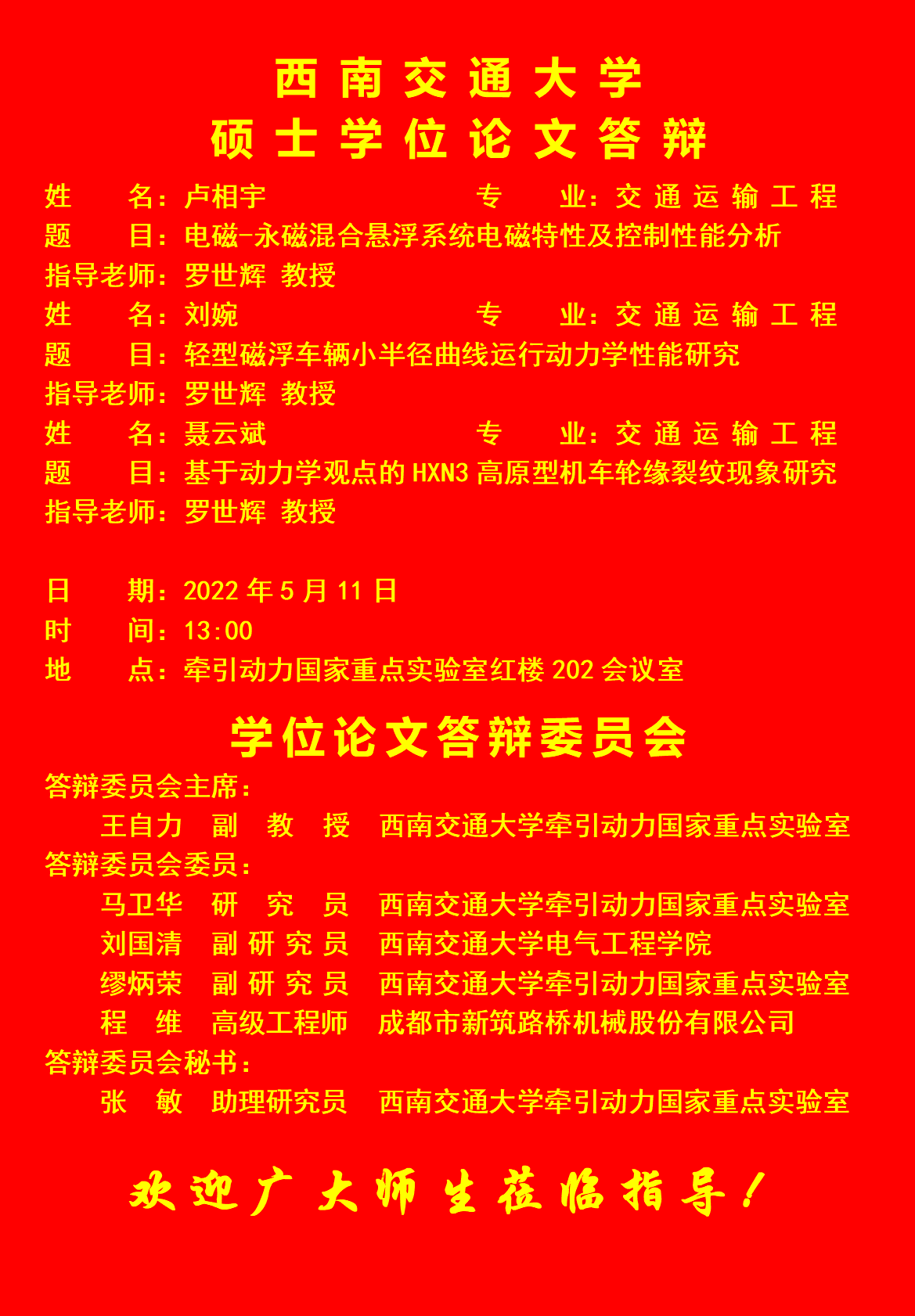 西南交通大学卢相宇、刘婉、聂云斌硕士学位论文答辩