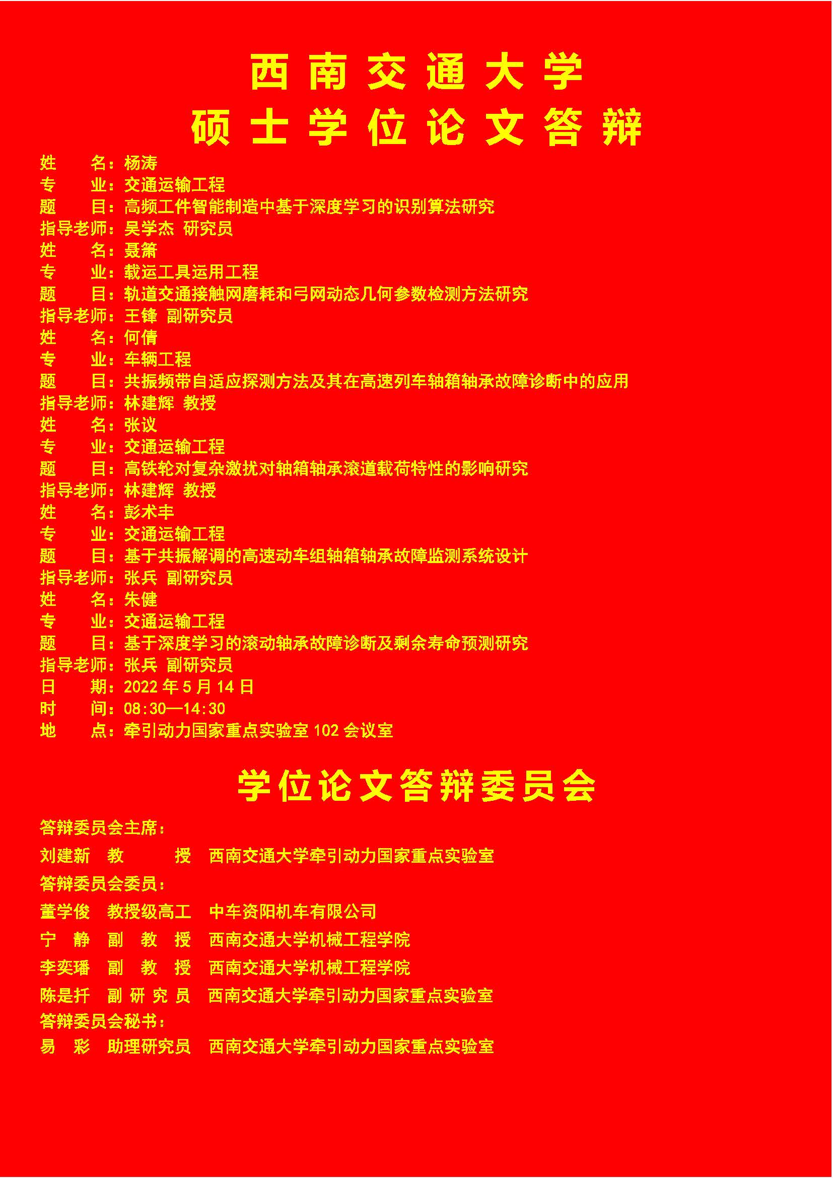 西南交通大学杨涛、聂萧、何倩、张议、彭术丰、朱健硕士学位论文答辩